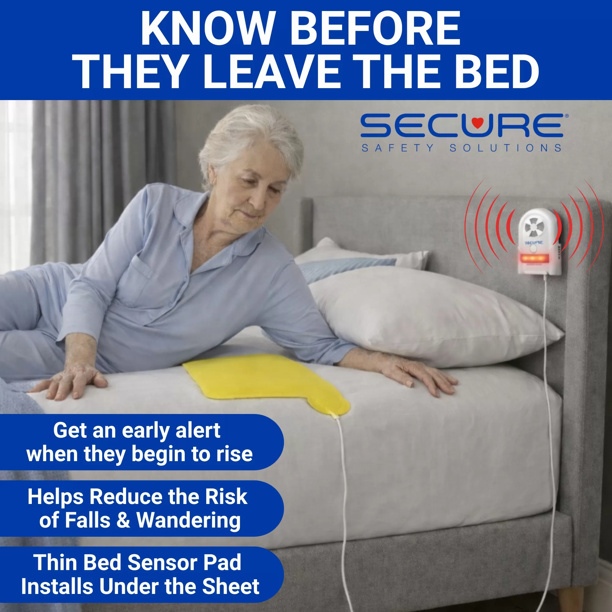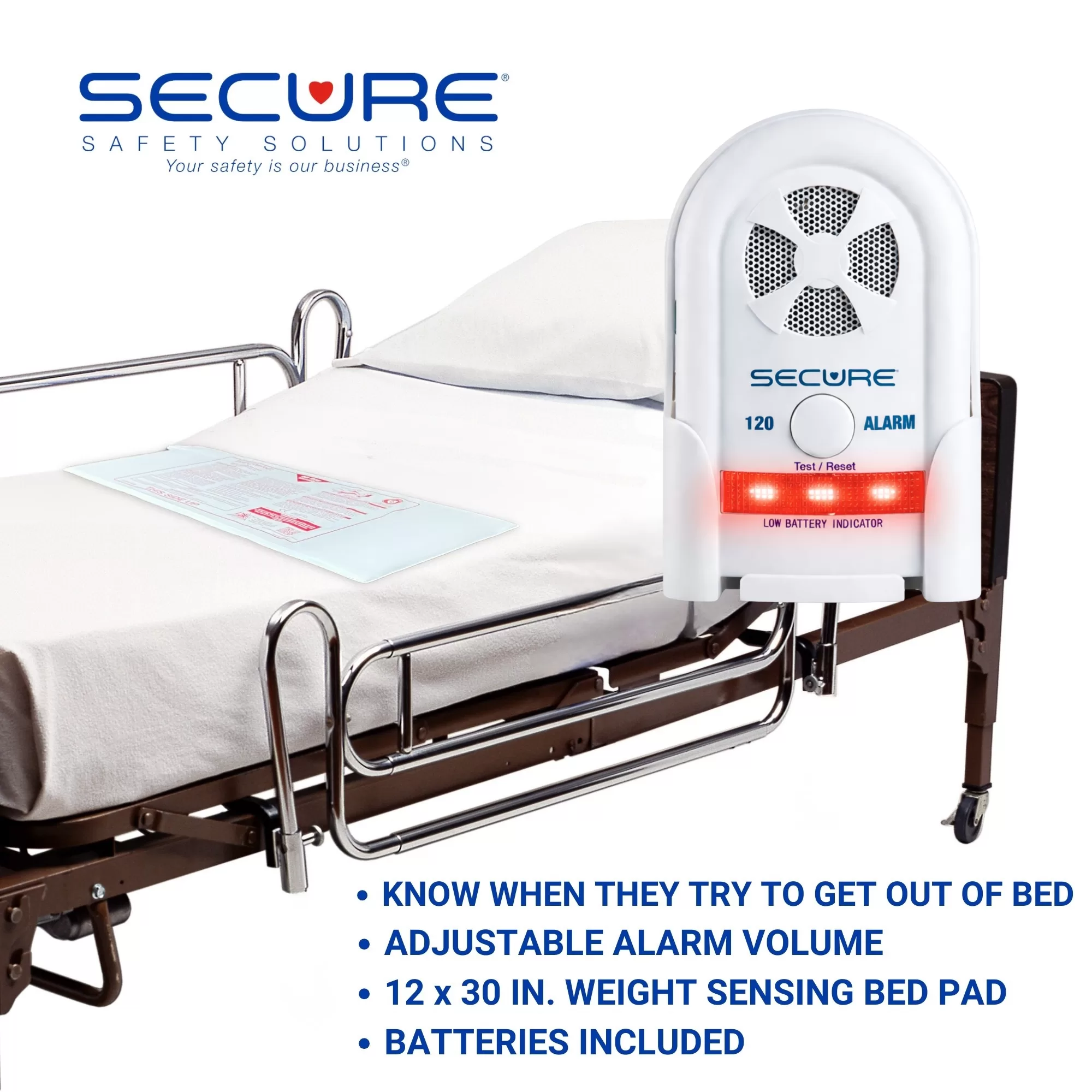 The Secure 14BSET-5 Bed Exit Alarm Set protects bedridden fall-risk patients and loved ones by alerting caregivers when an attempt is made to exit the bed. The bed sensor cord plugs into the alarm monitor mounted near the side of the patient’s bed. The alarm will sound in the room when pressure is removed from the sensor pad. The alarm will automatically reset when the patient returns to the sensor, or the alarm can be silenced via the tamper-resistant 3-press reset button.