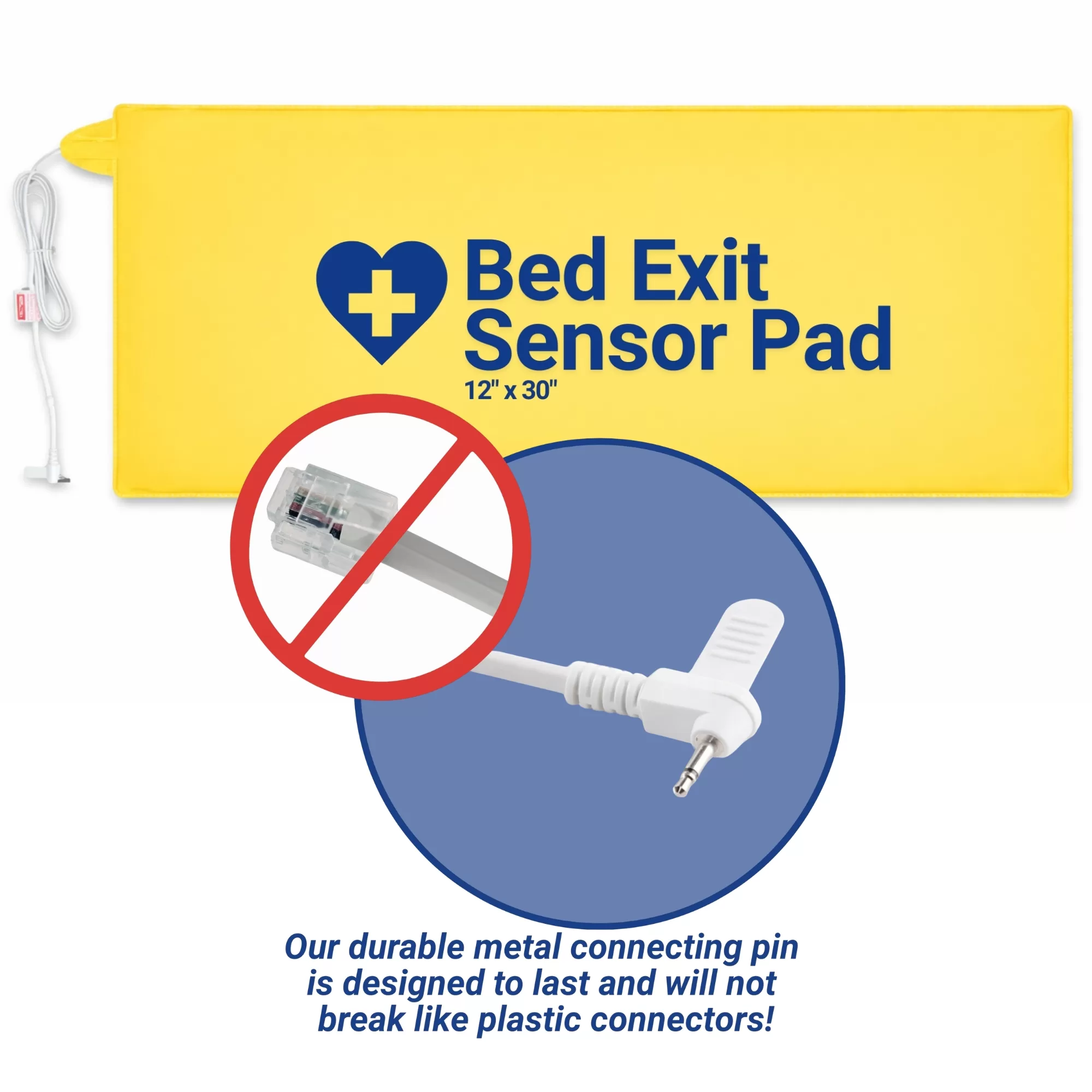 The bed sensor pad connector is made of metal, ensuring it does not break like competitors’ plastic connectors. A 5 ft. connecting cord is provided, and a 2 ft. extension cord is also available for mounting the alarm farther from the patient. The bed sensor pad can be used on all types of mattresses.