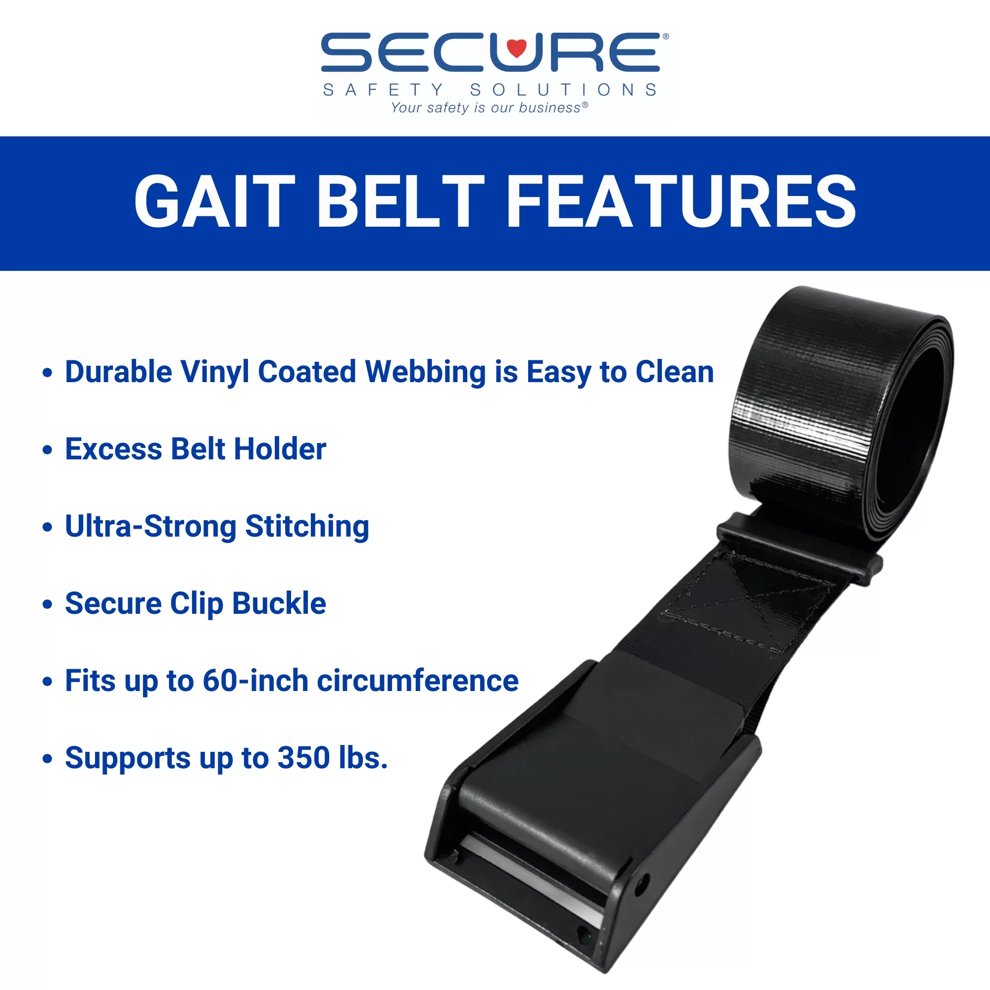 The Secure Infection Control Gait Belt aids in lifting, walking, or transferring residents. 60” EZ Clean, durable vinyl-coated webbing with a secure clasp buckle. Includes a loop to hold excess belt length.