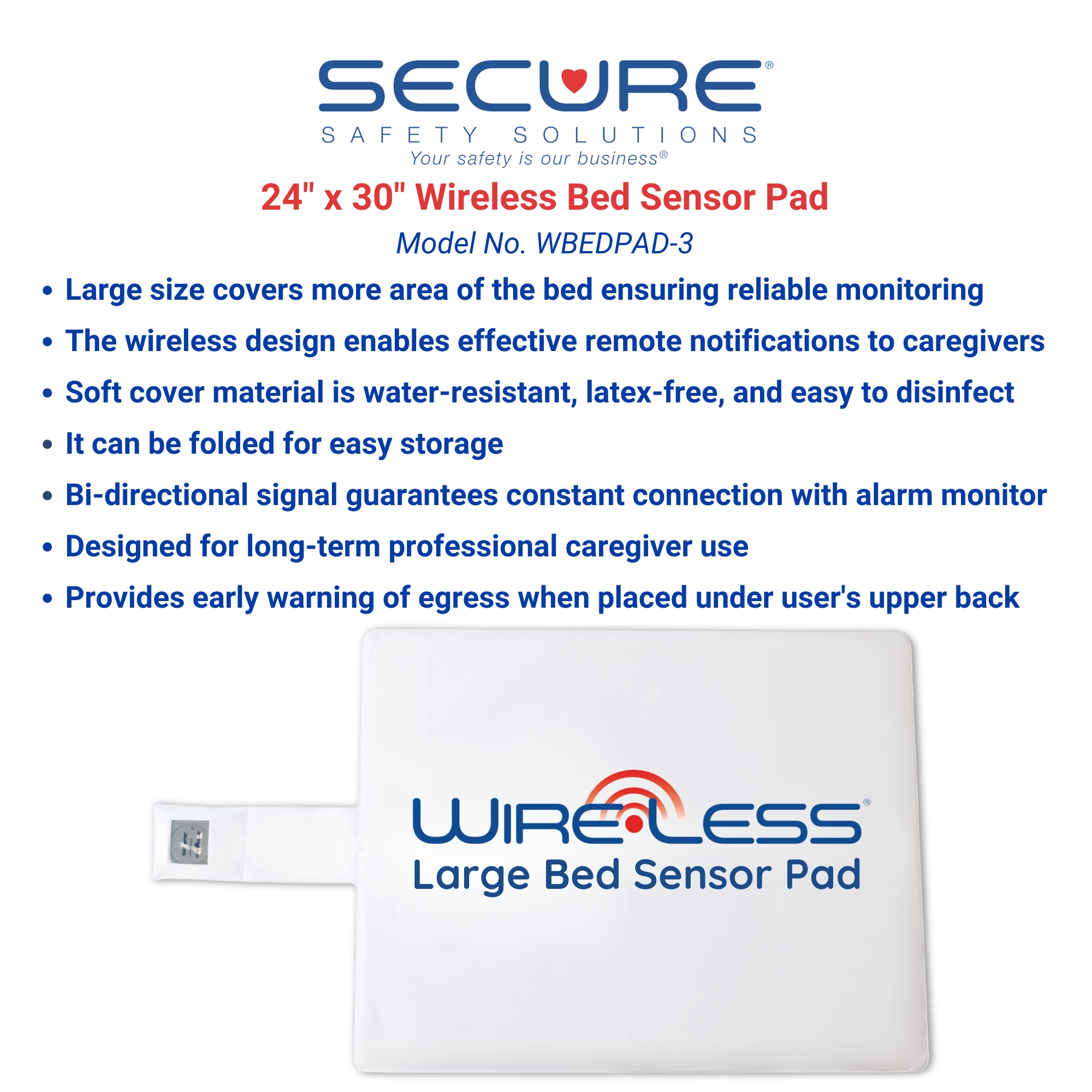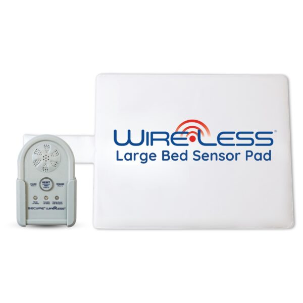 The Large Wireless Bed Alarm Set includes a 24″ x 30″ Wireless Bed Sensor Pad (WBEDPAD-3), Wireless Alarm Monitor (WAM-1R), and Wireless Alarm Transmitter (WAT-1R). Designed for remote patient monitoring, it helps prevent falls and wandering in individuals at risk—such as those with dementia, Alzheimer’s, or cognitive impairment.